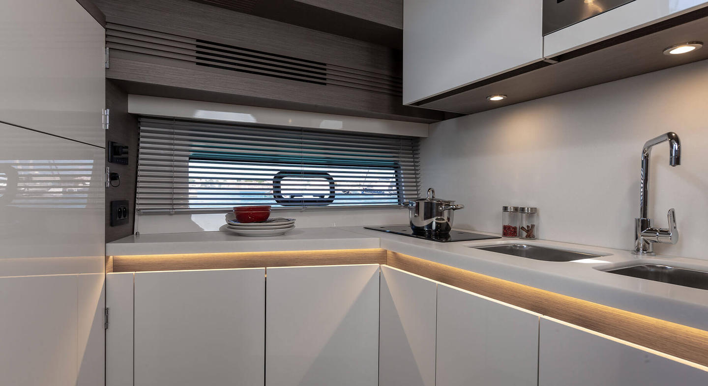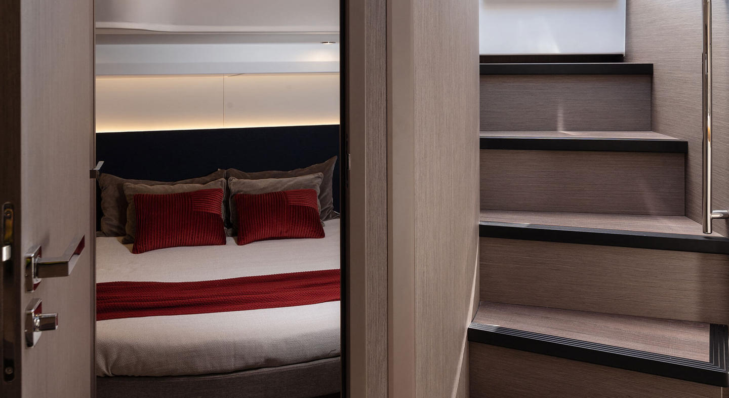 Sul ponte inferiore sono previsti tutti i comfort per prolungare l’uscita in mare: una bellissima cabina armatoriale a poppa con il suo bagno indipendente, una cabina ospiti a prua con secondo bagno, un quadrato accogliente e una grande cucina attrezzata. L’atmosfera elegante e calda regalata dal legno di noce grigio è il marchio distintivo della nuova generazione di express cruiser.