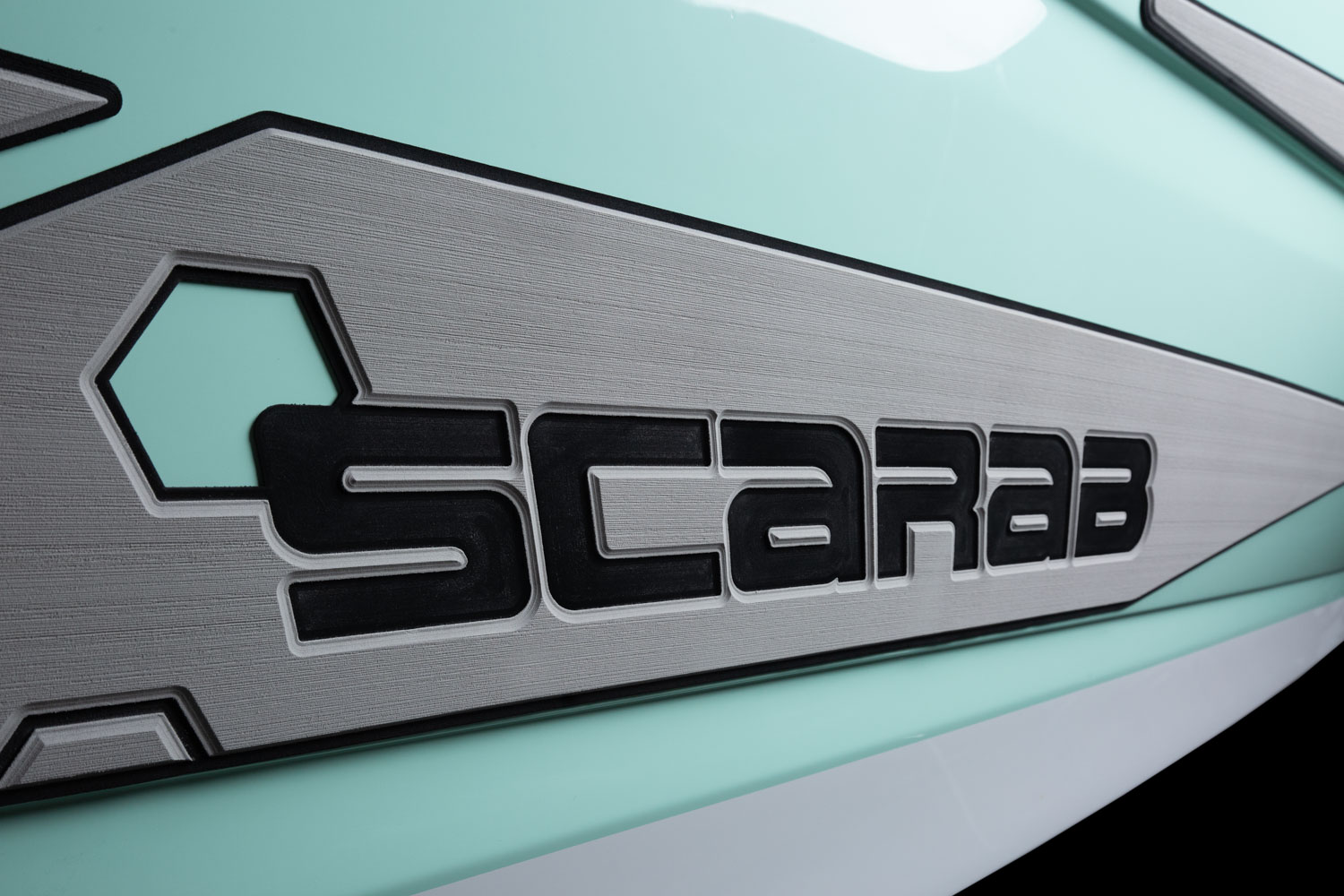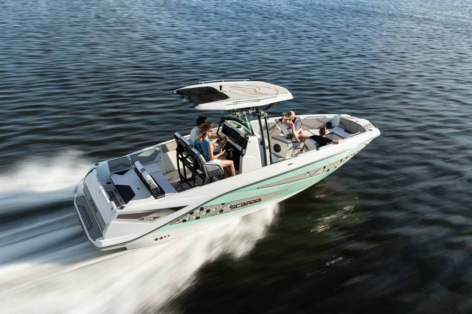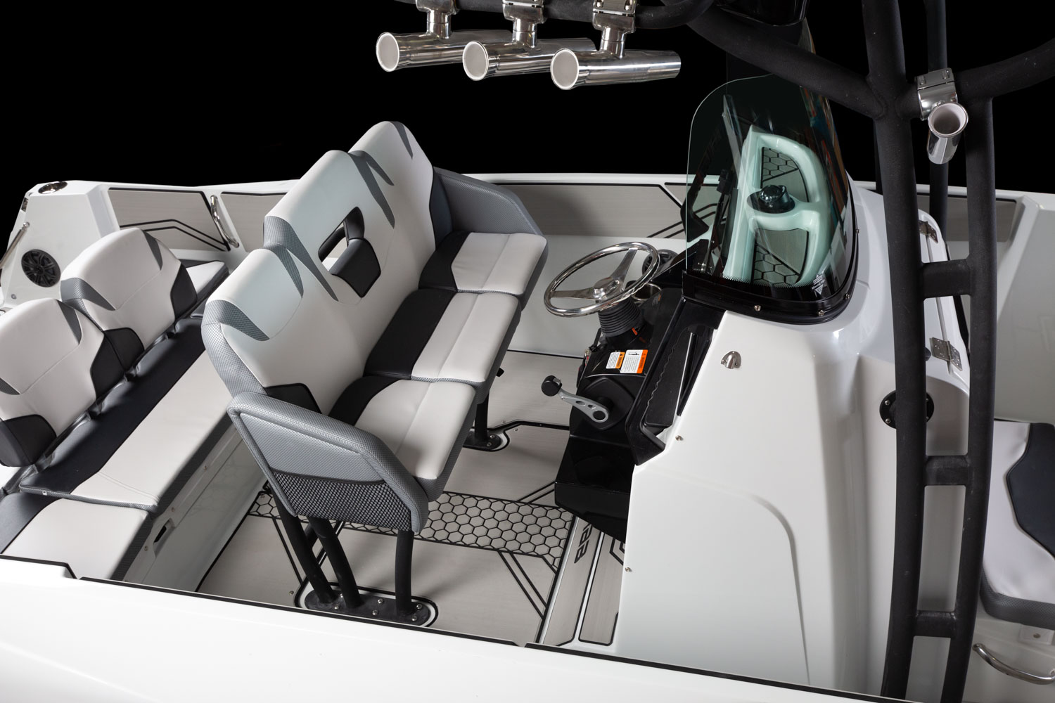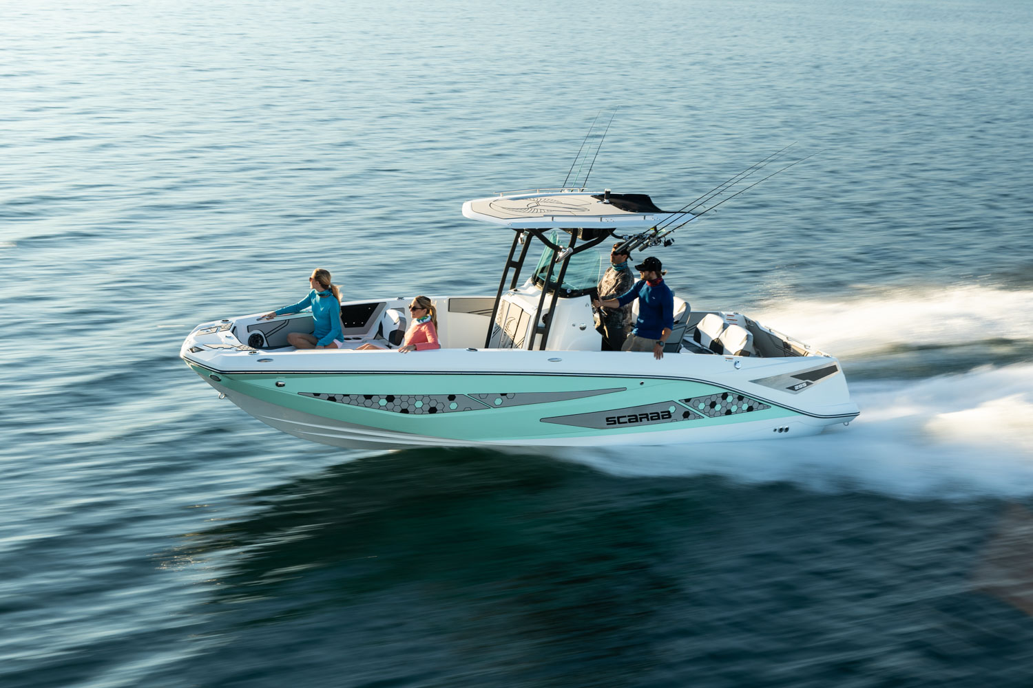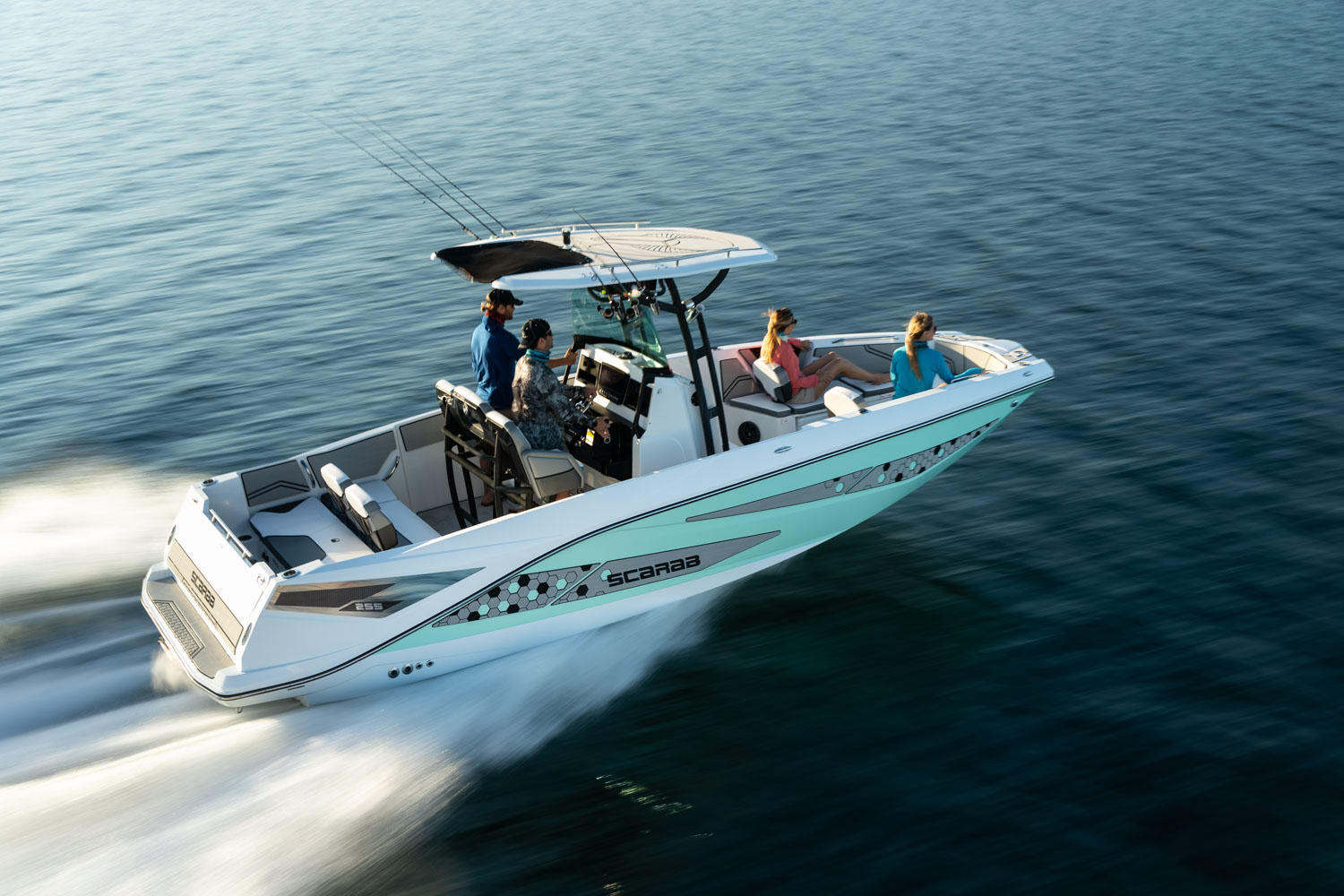 T-top, fiberglass hardtop w/ tow point, electronics box, spreader light(s) & Scarab graphic mat