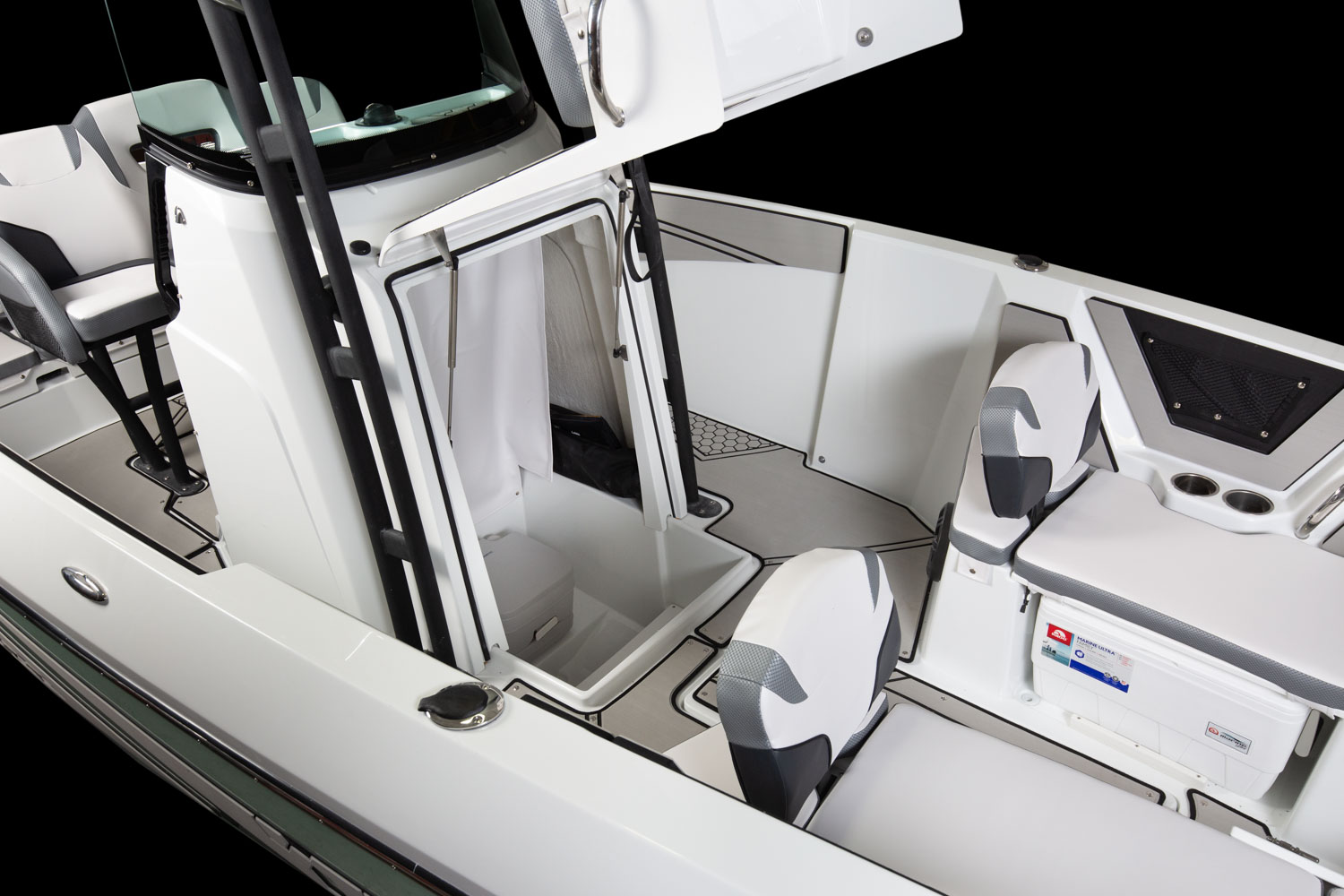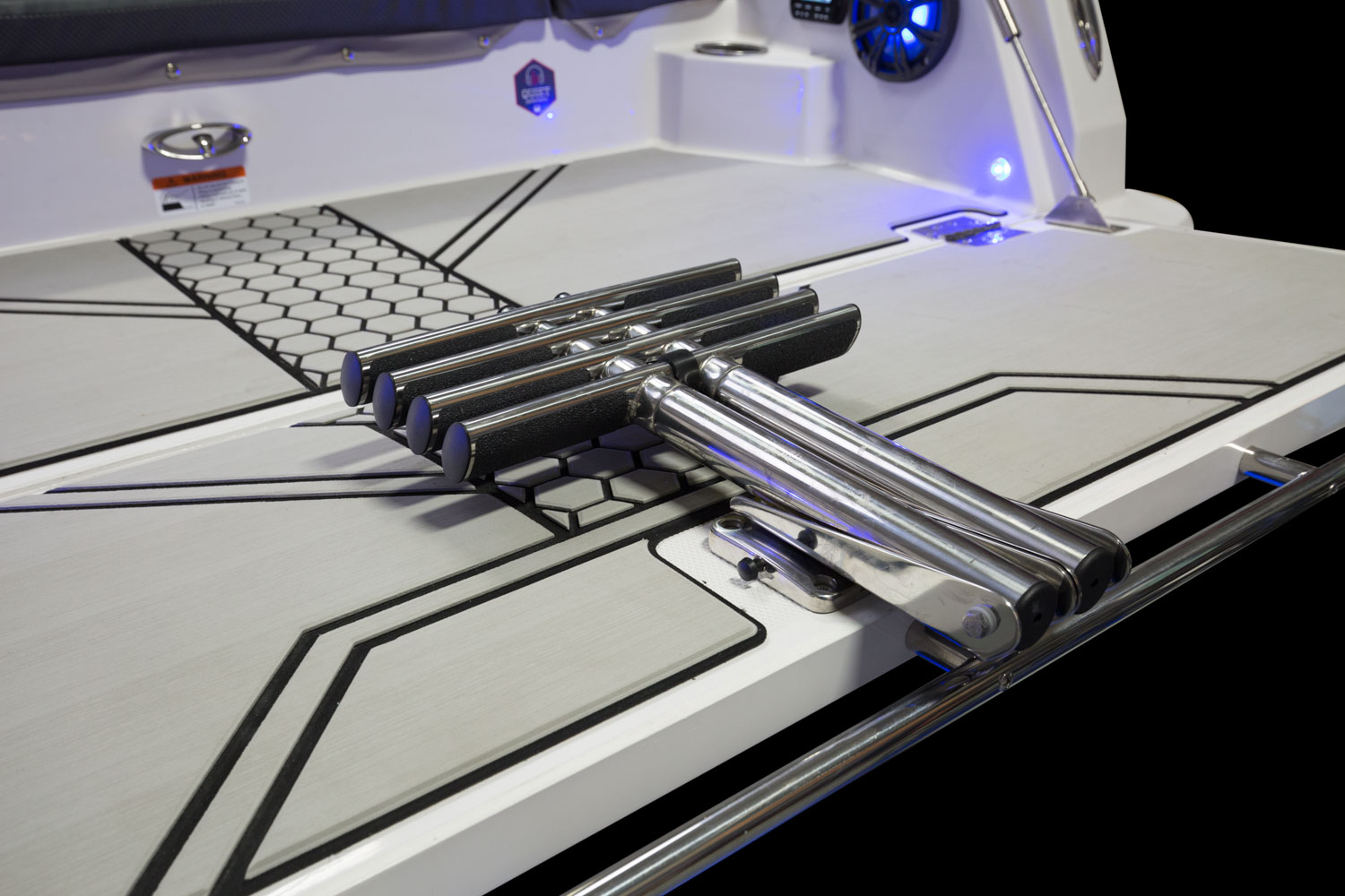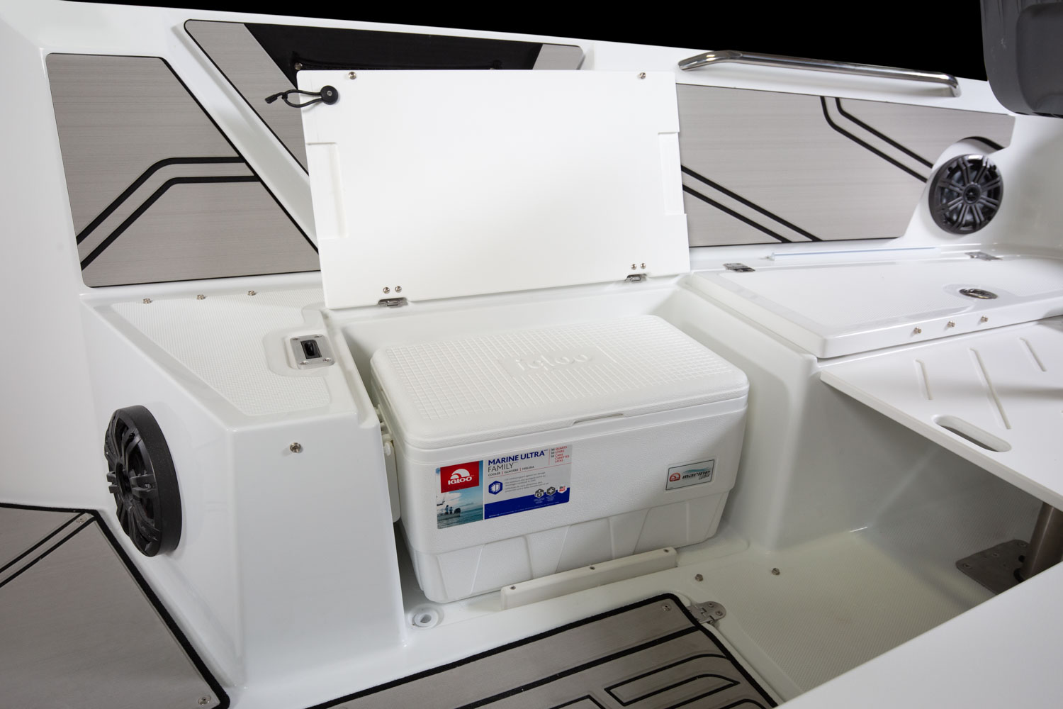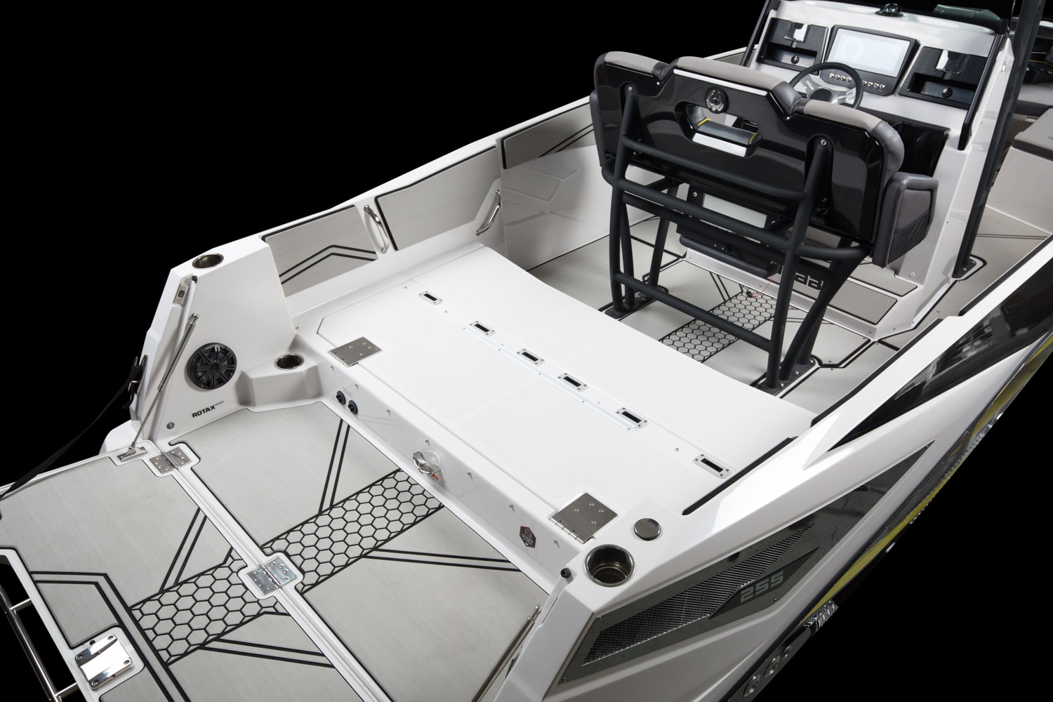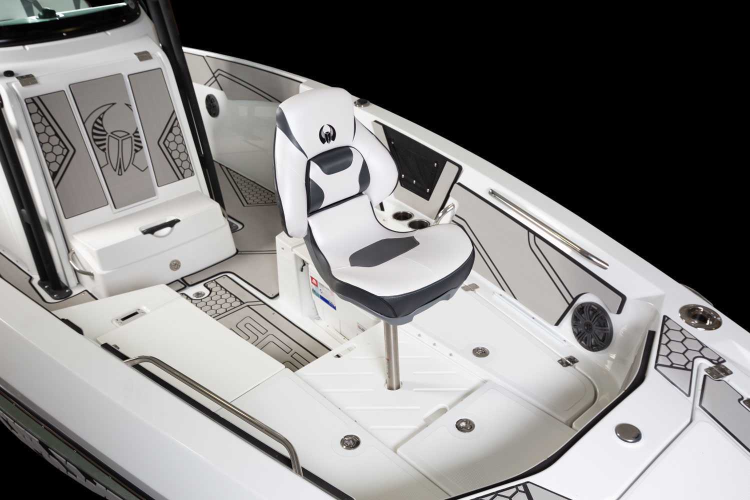 T-top, fiberglass hardtop w/ tow point, electronics box, spreader light(s) & Scarab graphic mat