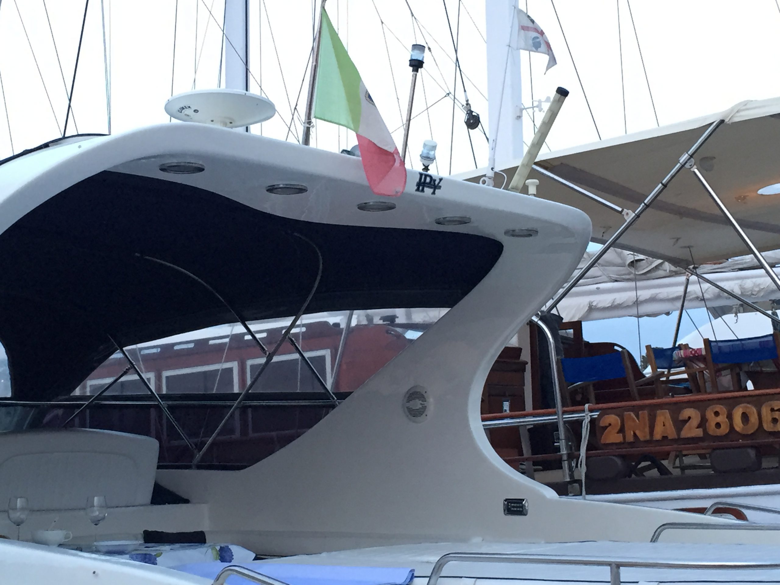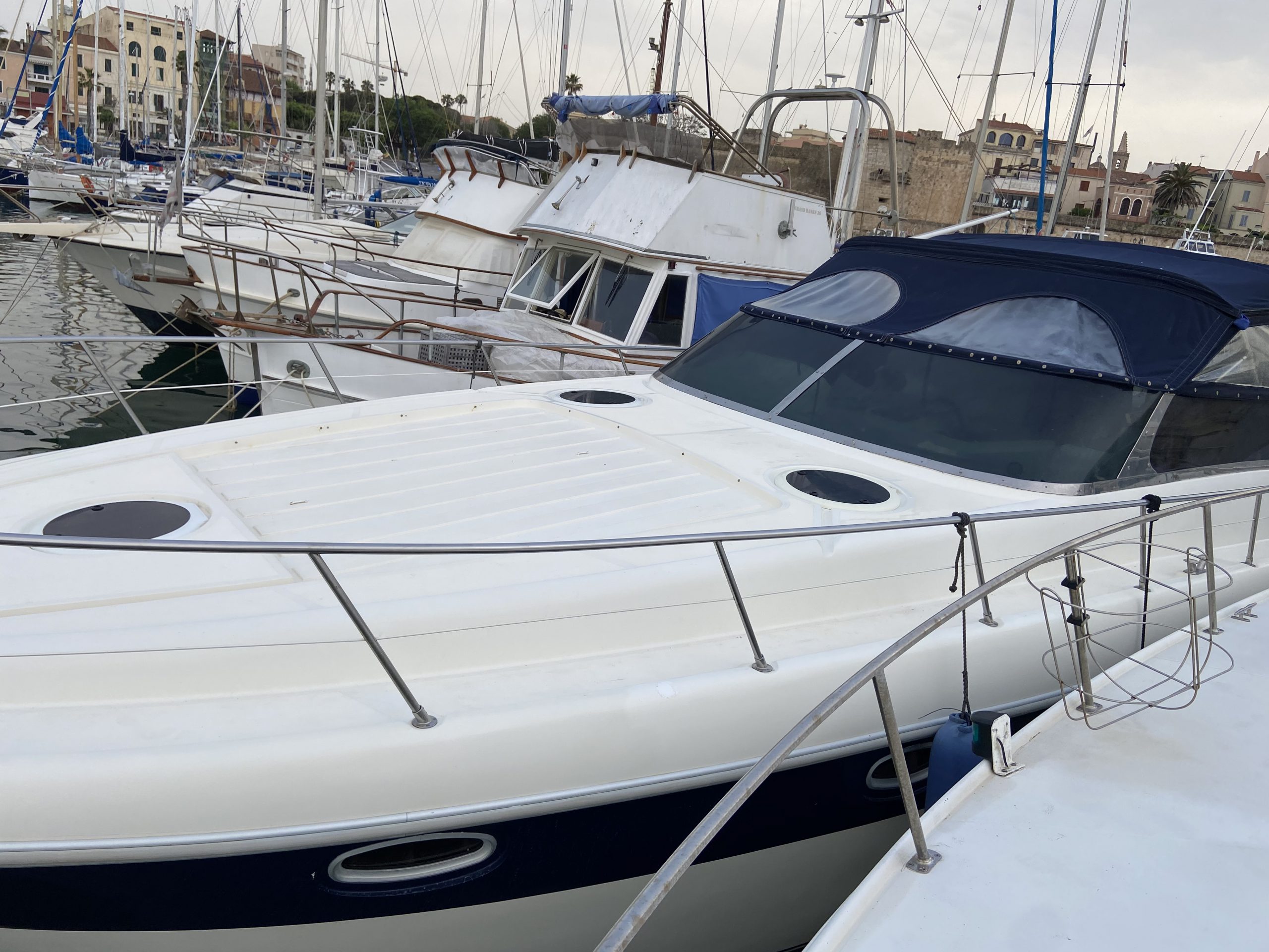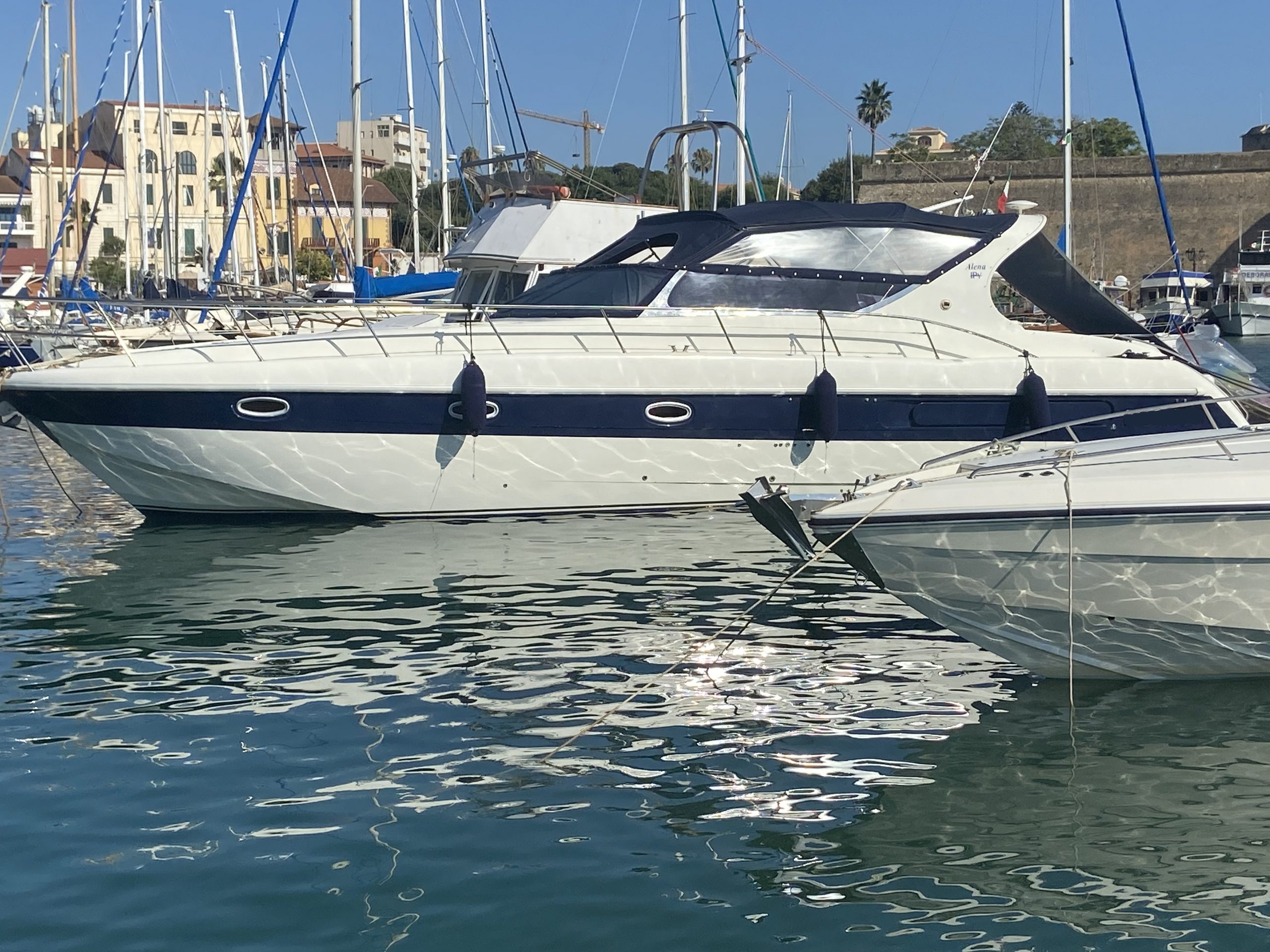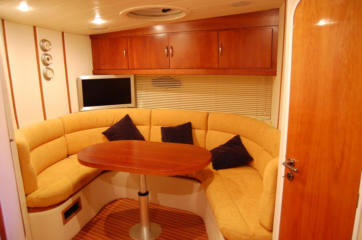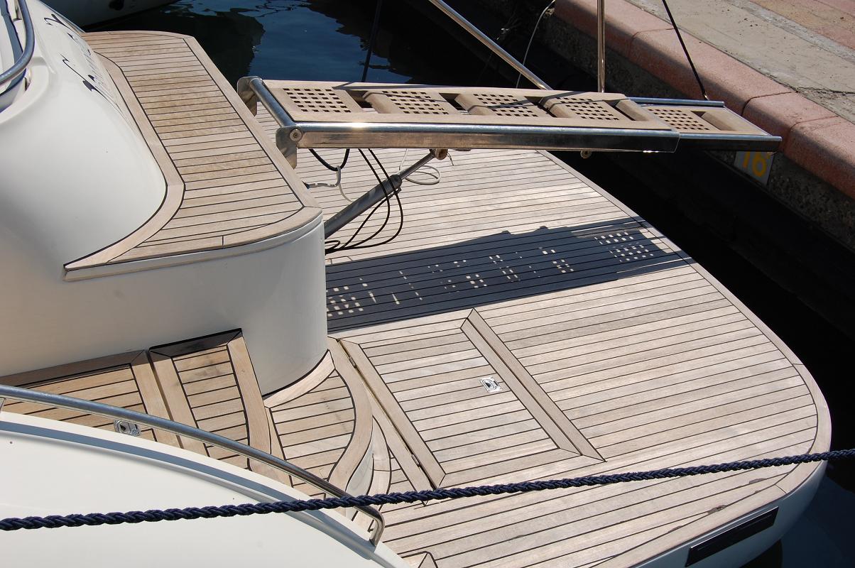 Interni: 3 cabine matr. 3 bagni di cui una con accesso esterno indipendente a poppa, cucina con 4 fuochi induzione Tv lcd Strumentazione Elettronica: Vhf –Gps 11 pollici- altri 2 gps portatile- ecoplotter- bussola digitale-Pilota automatico interfacciato –Stereo casse esterno –Stazione metereologica- telefono satellitare-Accessori : Verr. Elettr.-Elica prua –Passerella idraulica con 2 telecomandi-Generatore 6,5 kw- aria condizionata separata riscaldamento – carica batter elettronico- frigo interno e frigo con lavello esterno, tendalino est- divani contrapposti, testate letti- pareti camere- cuscinerie interne ed esterne- tutti personalizzati, mobili in vero legno, convertitore per TV corr 24220- lavello cucina- cucina gas- marmi cucina e bagni (ultraleggeri) –acciai esterni (benetti)-posizionamento teack da 1,5 mm sia nel pozzetto che nella pedana-scaletta esterna- pedana esterna- led luminosi bleu- luci roll-bar –luci sotto pedana.- centralina scaletta idraulica- insonorizzante sala macchina- luci sala macchina- ETC ETC…..