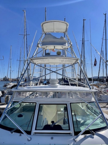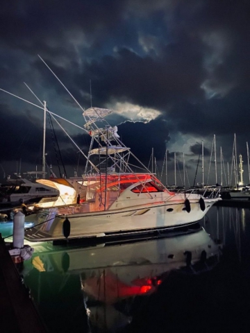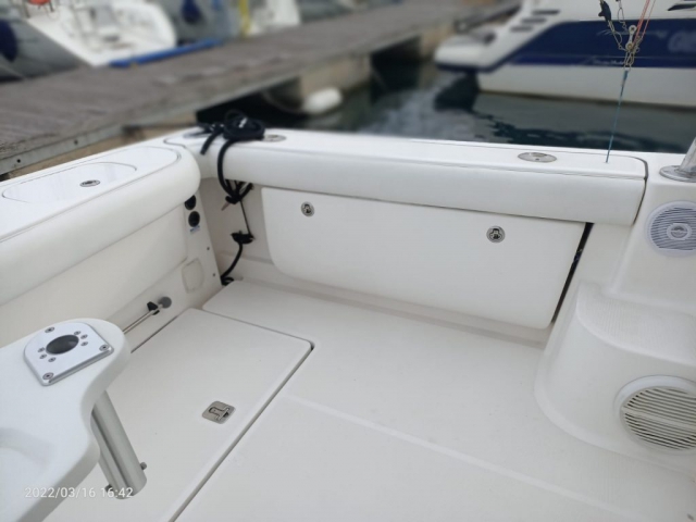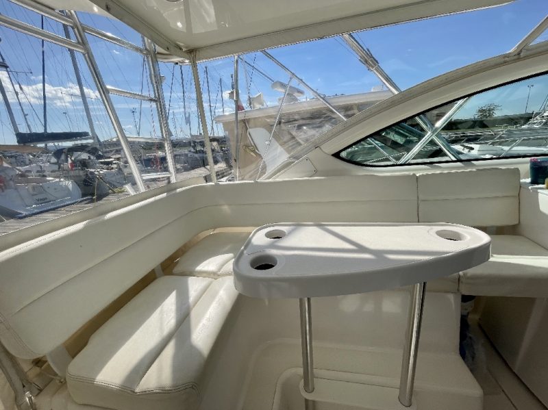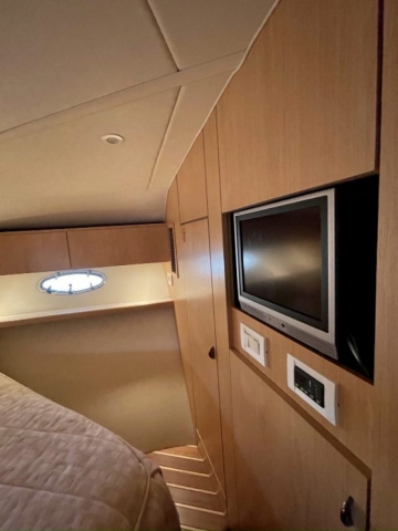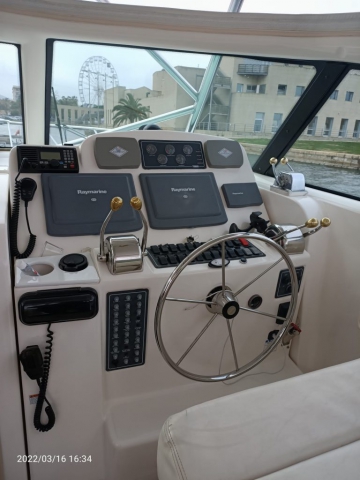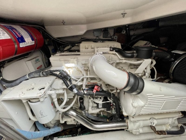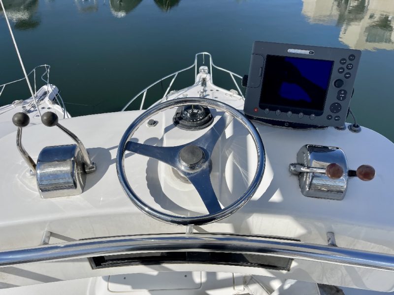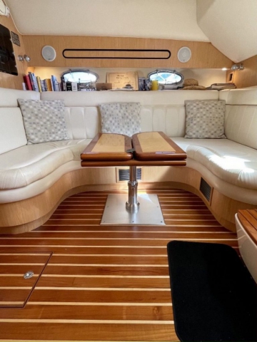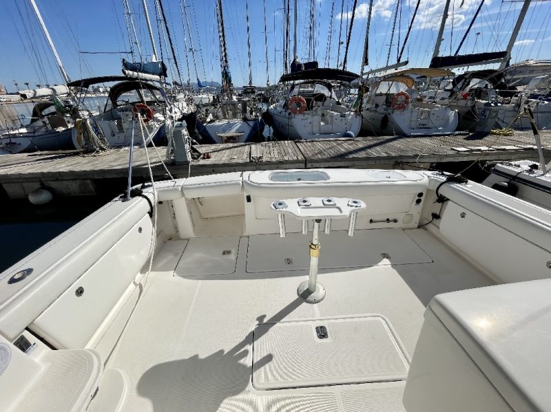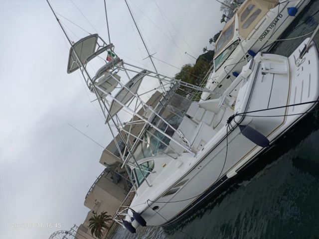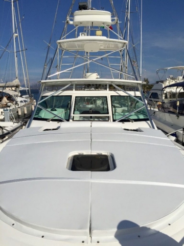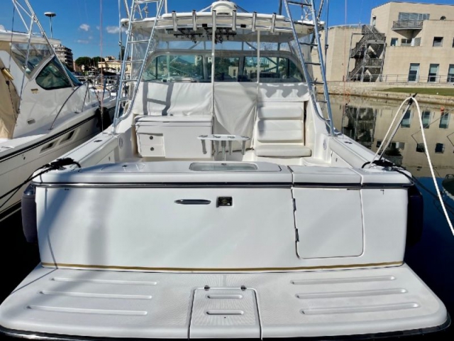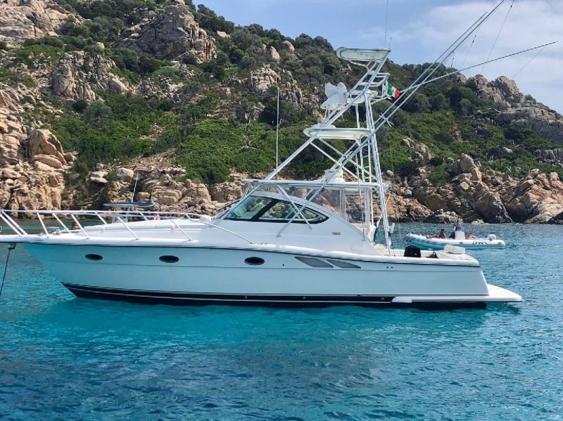 Tiara 3800 Open versione TTS (Open Tournament Edition), in perfette condizioni, motorizzata con una coppia di entrobordo Cummins Diesel da 490 Cv., dotati di Trolling Valve, con circa 1900 ore di moto (la maggior parte al minimo regime per la pesca alla traina), tagliandati regolarmente ogni anno. La versione TTS si differenzia dalla barca di serie per alcuni particolari importantissimi, tra cui la marlin tower, i particolari esterni in alluminio e le vasche del vivo e del pescato più capienti. La configurazione della cabina di questa barca è definita dalla Tiara come “Plan A” ovvero con la cabina di prua separata, la dinette molto ampia con divano trasformabile ed angolo cucina ed il bagno separato con box doccia. Gli interni sono in palissandro chiaro, le cuscinerie interne ed esterne sono in ottime condizioni: quelle interne sono state realizzate su misura. La Marlin Tower Pipewelder, un accessorio che veniva montato aggiungendo 120.000,00 dollari, è dotata dei doppi comandi di guida e della strumentazione elettronica.