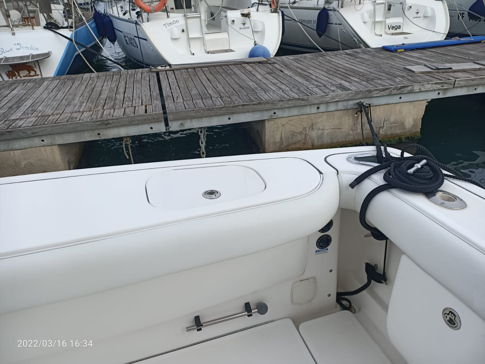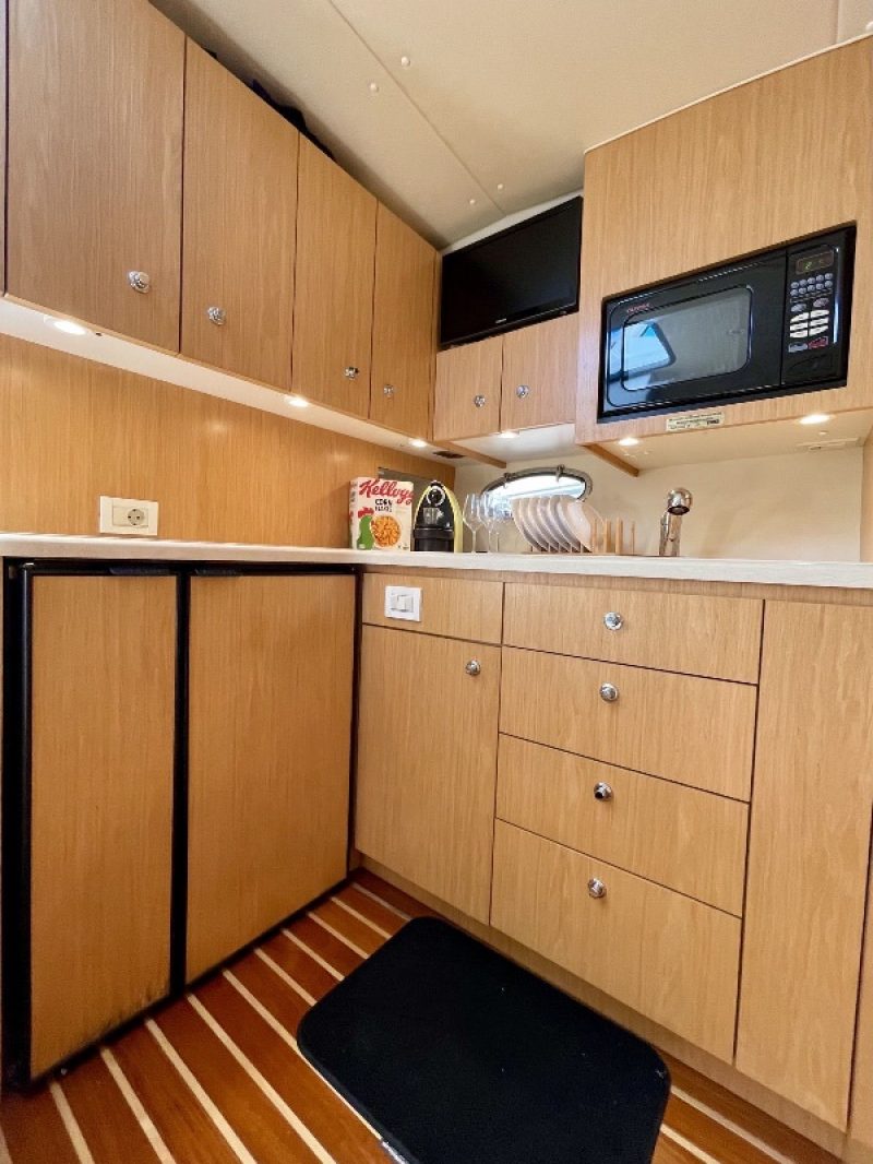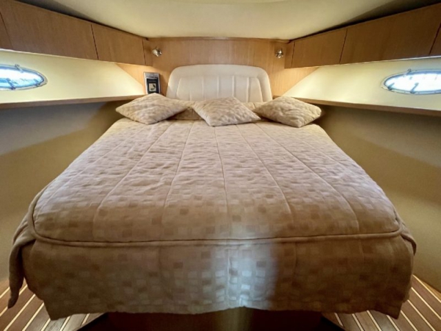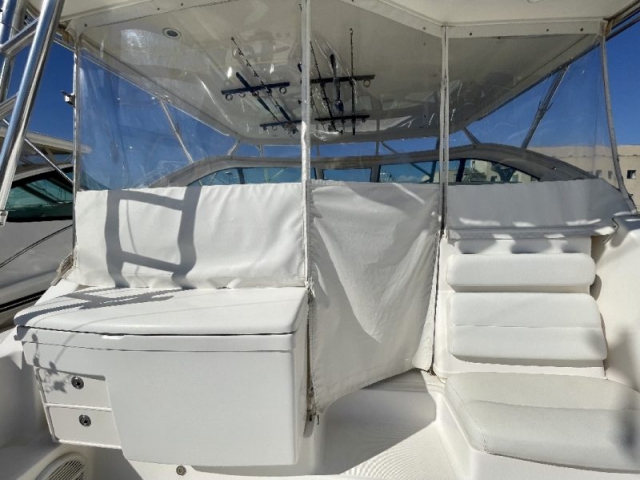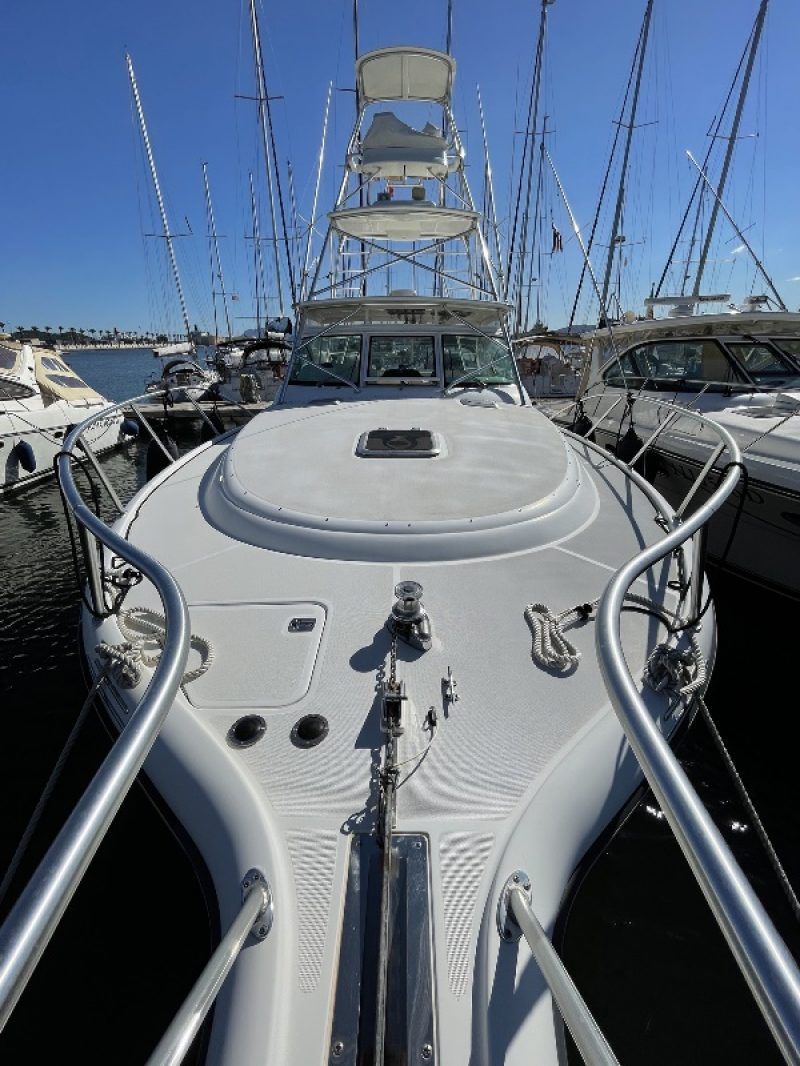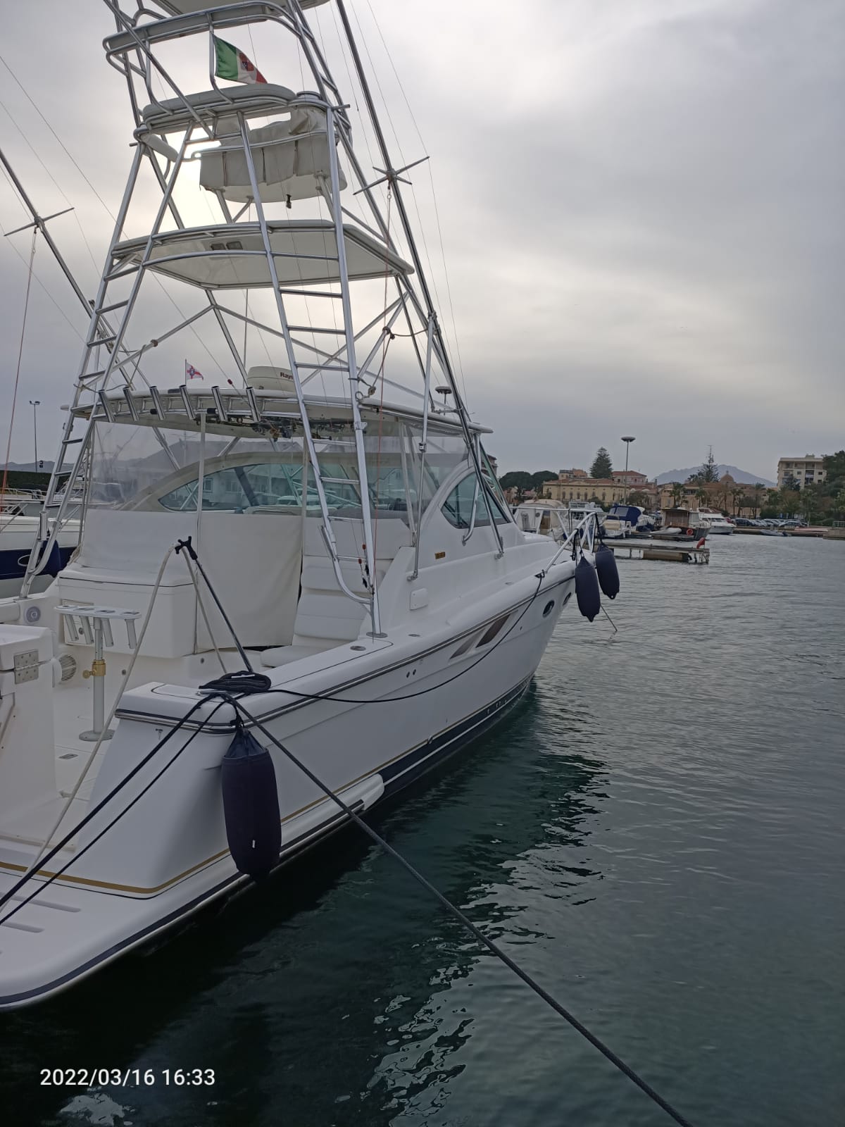 Tiara 3800 Open versione TTS (Open Tournament Edition), in perfette condizioni, motorizzata con una coppia di entrobordo Cummins Diesel da 490 Cv., dotati di Trolling Valve, con circa 1900 ore di moto (la maggior parte al minimo regime per la pesca alla traina), tagliandati regolarmente ogni anno. La versione TTS si differenzia dalla barca di serie per alcuni particolari importantissimi, tra cui la marlin tower, i particolari esterni in alluminio e le vasche del vivo e del pescato più capienti. La configurazione della cabina di questa barca è definita dalla Tiara come “Plan A” ovvero con la cabina di prua separata, la dinette molto ampia con divano trasformabile ed angolo cucina ed il bagno separato con box doccia. Gli interni sono in palissandro chiaro, le cuscinerie interne ed esterne sono in ottime condizioni: quelle interne sono state realizzate su misura. La Marlin Tower Pipewelder, un accessorio che veniva montato aggiungendo 120.000,00 dollari, è dotata dei doppi comandi di guida e della strumentazione elettronica.